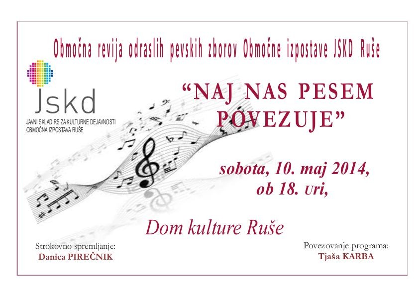Kot vsako leto v tem času, se bodo tudi letos na reviji srečali odrasli pevski zbori sosednjih občin. V soboto, 10. maja 2014, bo ob 18. uri v Domu kulture Ruše zapelo sedem odraslih pevskih zborov, ki delujejo v Območni izpostavi JSKD OI Ruše. Zapeli bodo moški, ženski in mešani pevski zbori.
