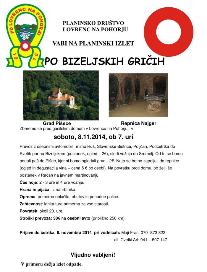 Prijave do četrtka, 6. novembra 2014 pri vodnicah: Maji Fras: 070 -873 822 ali Cvetki Arl: 041 – 507 147