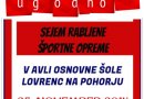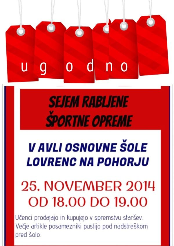 V torek, 25. 11. 2014, bo v avli Osnovne šole Lovrenc na Pohorju potekal SEJEM RABLJENE ŠPORTNE OPREME. Od 18. do 19. ure lahko kupujete ali prodajate vso rabljeno športno opremo. Cene določite sami, učenci pa morajo prodajati in kupovati v spremstvu odraslega. Večje artikle pustite pred šolo. Sejem je organiziran v okviru EKO šole.