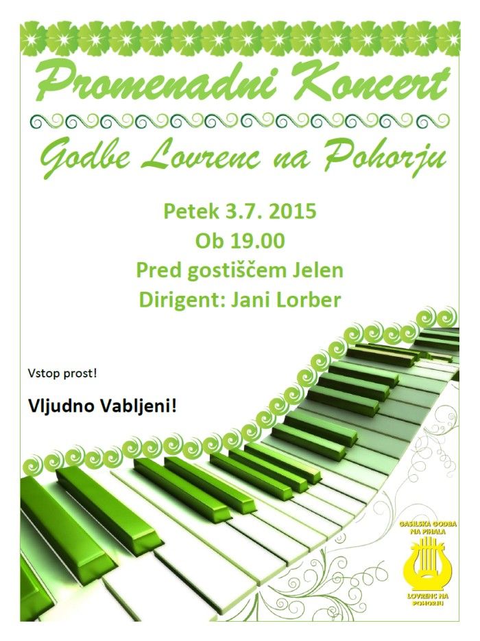 Promenadni koncert godbe Kdaj: 3. 7., ob 19.00 Kje: pred gostiščem Jelen Kdo: Gasilska godba na pihala Promenadni koncert gasilske godbe na pihala.