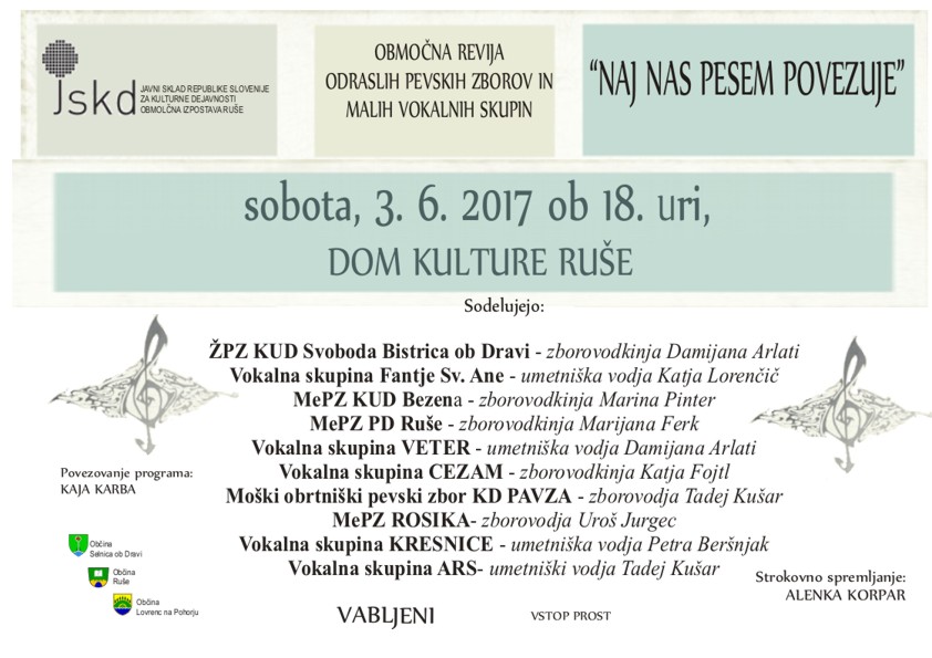 V soboto, 3. junija 2017 bo ob 18. uri, v Domu kulture Ruše zapelo 140 pevk in pevcev, ki prepevajo v različnih zasedbah.