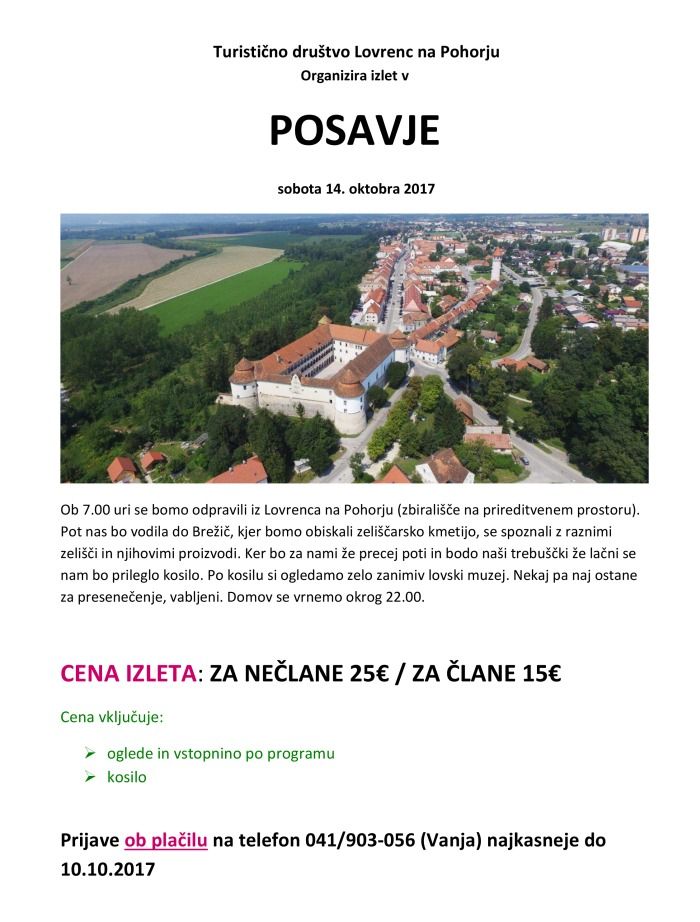 Turistično društvo Lovrenc na Pohorju Organizira izlet v POSAVJE v soboto 14. oktobra 2017