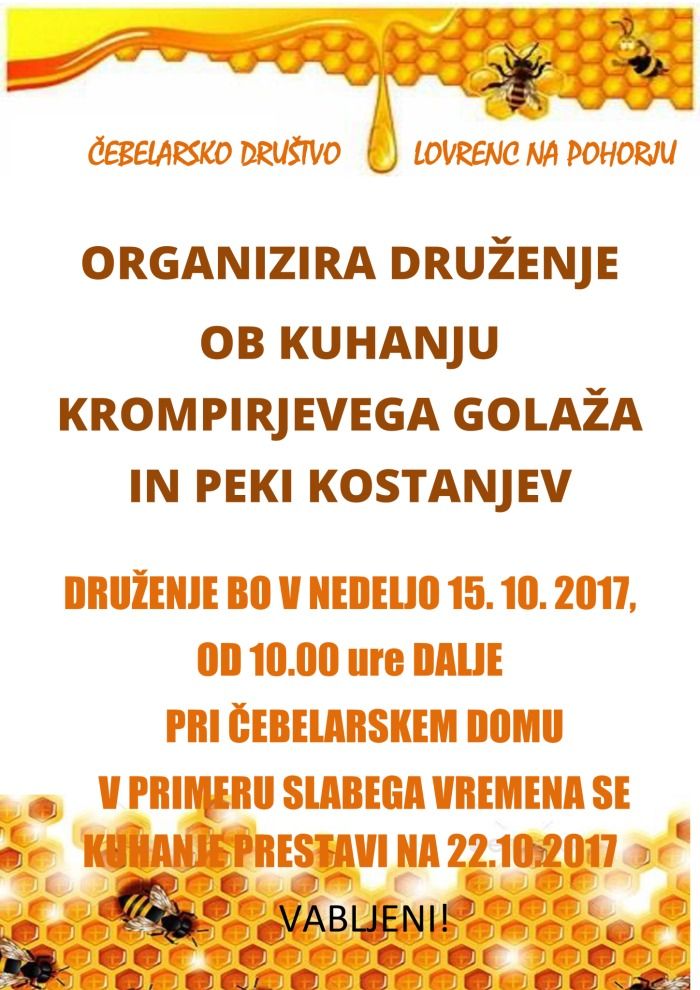 Kuhanje bo v nedeljo, 15. oktobra 2017 s pričetkom ob 10.00 uri pri čebelarskem domu v Lovrencu na Pohorju.