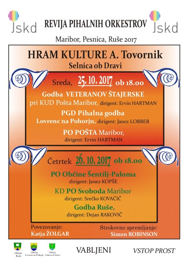 V sredo, 25.10.2017 in v četrtek 26.10.2017, bo ob 18 uri v Hramu kulture Selnica ob Dravi, zazvenela glasba pihalnih orkestrov.