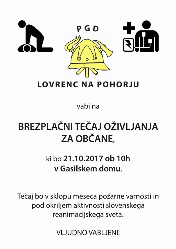 21.10.2017 ob 10. uri, ste vljudno vabljeni vsi občani in občanke v prostore gasilskega doma, kjer bo potekal brezplačni tečaj oživljanja. Vsakdo lahko reši življenje, tudi TI, zato se nam pridruži in pridobi ali obnovi svoje znanje da boš lahko pomagal/a v primeru zastoja srca. NA POMOČ!!!!