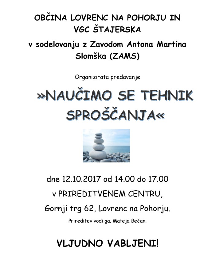 Na delavnici se bomo naučili prepoznati in ozavestiti dejavnike, ki povzročajo stres ter preproste in učinkovite tehnike sproščanja (pravilno dihanje, mišična relaksacija, vizualizacija, meditacija, zvočna sprostitev...).