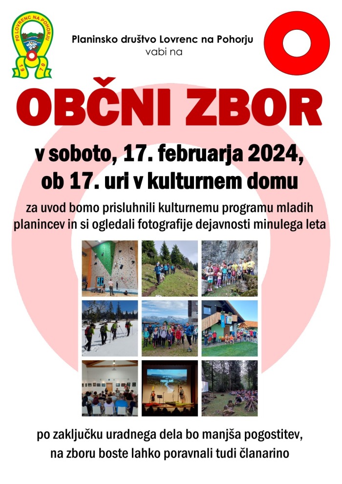 Planinsko društvo Lovrenc vabi v soboto, 17. februarja ob 17. uri v Kulturni dom Jožeta Petruna na redni letni občni zbor.