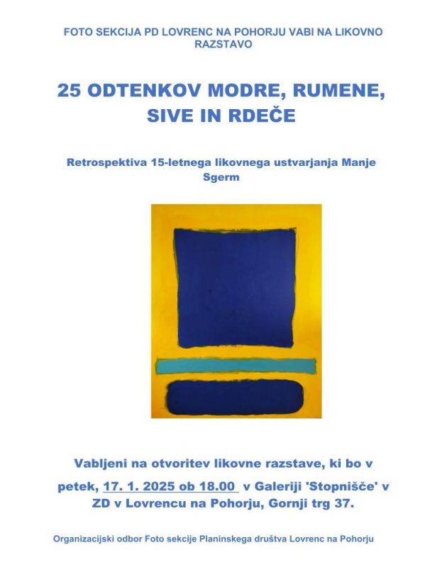 Foto sekcija PD Lovrenc na Pohorju vabi na likovno razstavo 25 odtenkov modre, rumene, sive in rdeče - retrospektiva 15-letnega likovnega ustvarjanja Manje Sgerm.