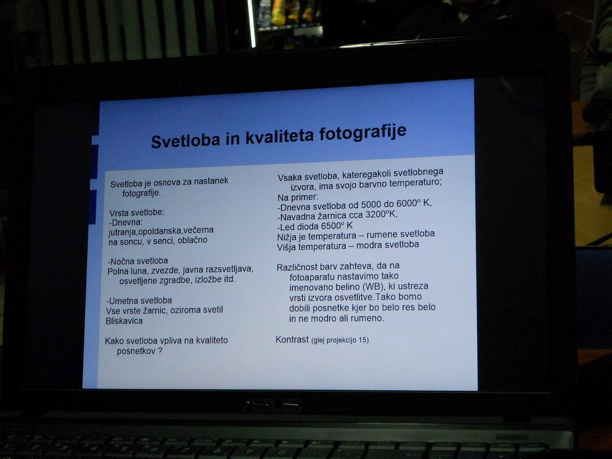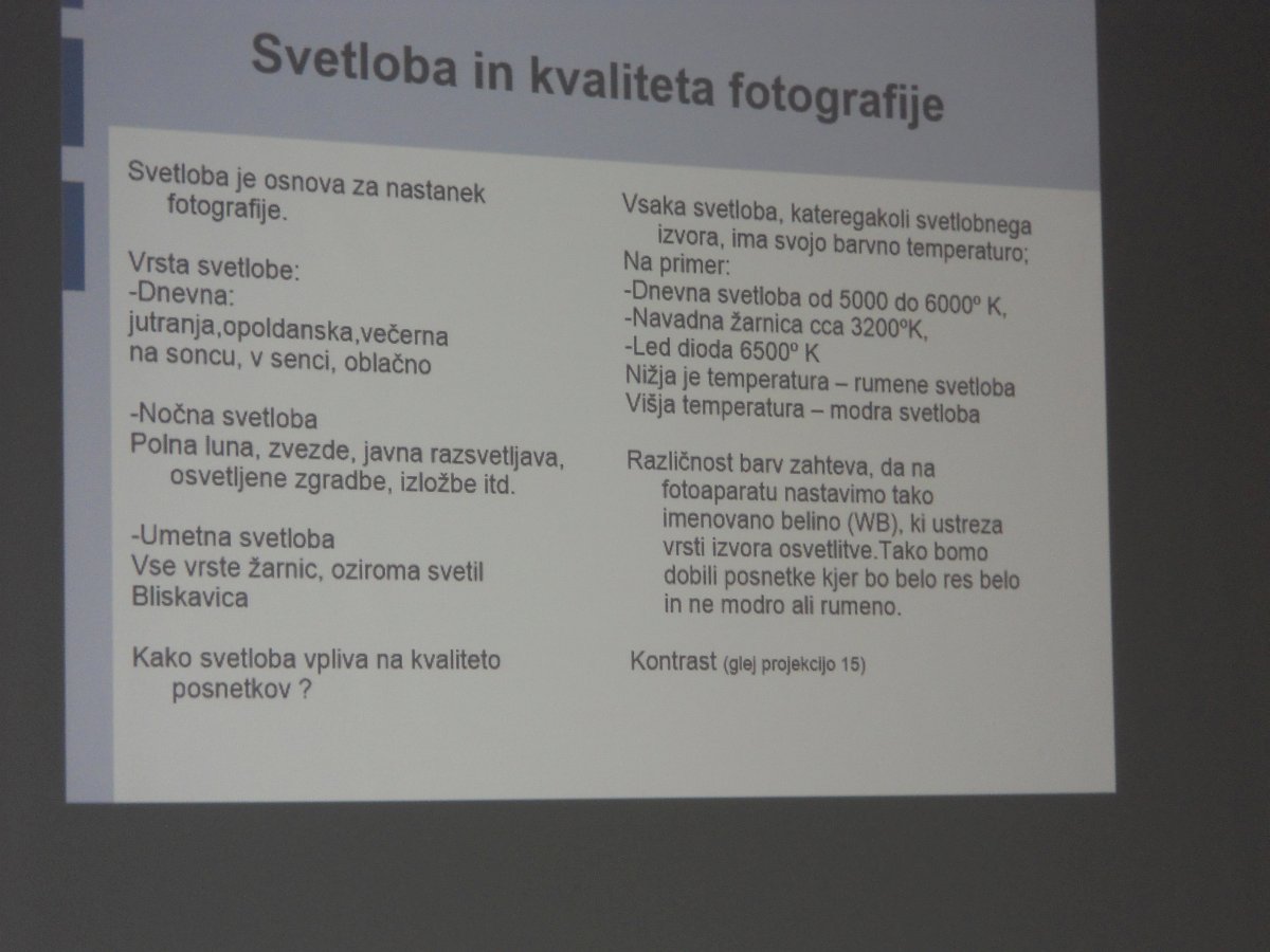Svoje znanje nam je posredoval gospod Vilijem Šetar, predsednik Komisije za tehnično kulturo v Zgornjepodravski pokrajinski zvezi DU Maribor, ob enem pa je tudi član foto društva TOTI FOTO iz Maribora. Ima veliko znanja in vidi se mu, da ima fotografije (in vse kar sodi zraven) rad.