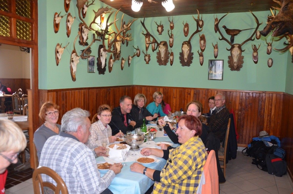 V gostišču Dovnik smo se najedli imenitnega pohorskega piskra ter se odpravili na ogled kraja in cerkve. Pri sv. Martinu nas je sprejel novi župnik g. Frangež in razkazal prelepo romansko cerkev z dragocenimi freskami iz 13. stoletja. Več kot desetletje dolga obnova tega pohorskega bisera je plod dela našega novega lovrenškega župnika g. Brezovnika.