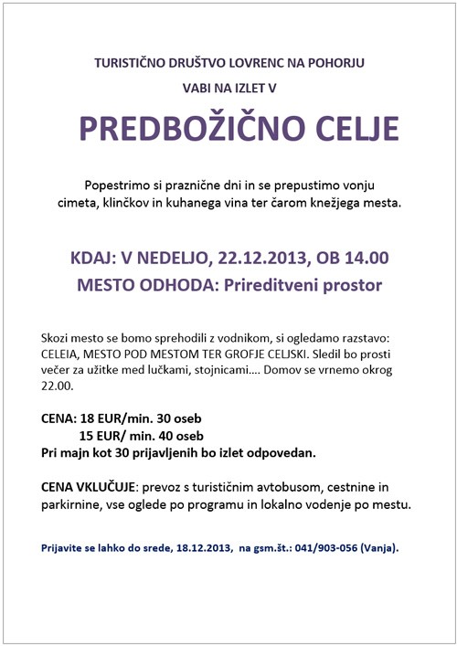 Turistično društvo Lovrenc vabi na izlet v predbožično Celje.