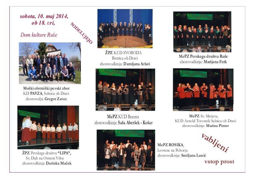 Kot vsako leto v tem času, se bodo tudi letos na reviji srečali odrasli pevski zbori sosednjih občin. V soboto, 10. maja 2014, bo ob 18. uri v Domu kulture Ruše zapelo sedem odraslih pevskih zborov, ki delujejo v Območni izpostavi JSKD OI Ruše. Zapeli bodo moški, ženski in mešani pevski zbori.