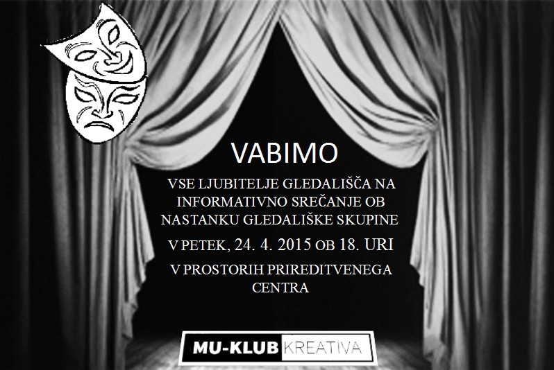 Vse ljubitelje gledališča, ki si želijo igranja, vabimo na informativno srečanje ob začetku gledaliških delavnic in ob nastanku gledališke skupine, v petek, 24. aprila 2015 ob 18. uri v prostorih prireditvenega centra Lovrenc na Pohorju.