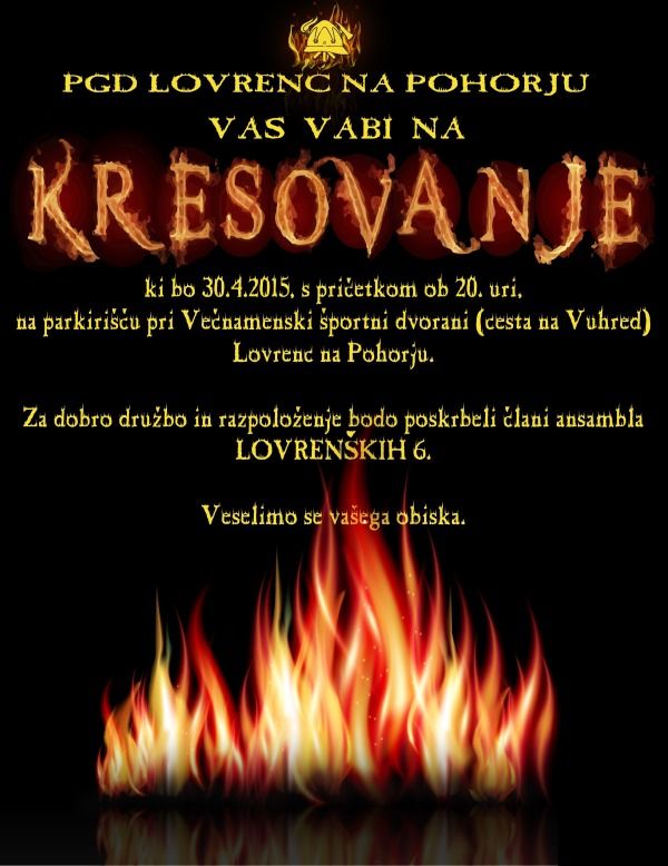 Prostovoljno gasilsko društvo Lovrenc prireja kresovanje, ki bo 30.4.2015, s pričetkom ob 20. uri, na parkirišču pri Večnamenski športni dvorani (cesta na Vuhred) Lovrenc na Pohorju.