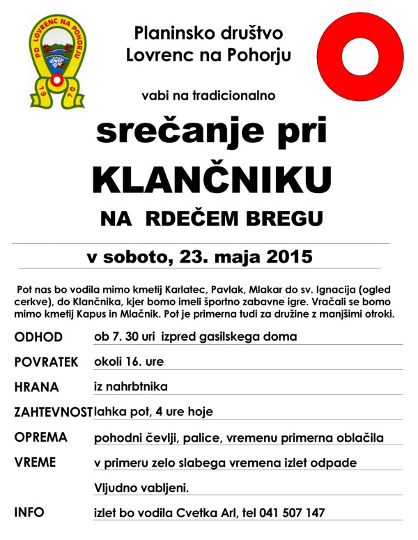 Zaradi zelo slabe vremenske napovedi je srečanje izlet na Rdeči breg h Klančniku ODPOVEDAN.