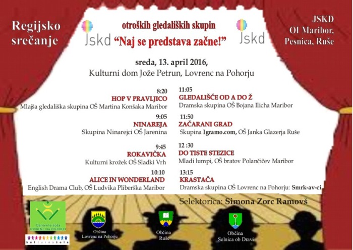 Javni sklad RS za kulturne dejavnosti, Območna izpostava Ruše organizira v sredo, 13. aprila 2016 v Kulturnem domu Jože Petrun REGIJSKO SREČANJE OTROŠKIH GLEDALIŠKIH SKUPIN, pod naslovom "NAJ SE PREDSTAVA ZAČNE".