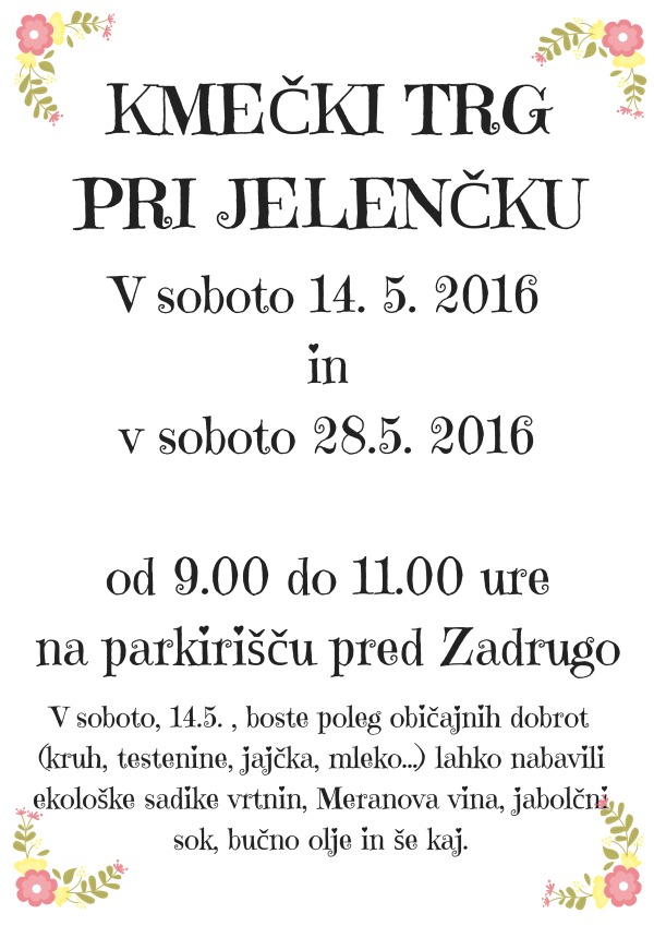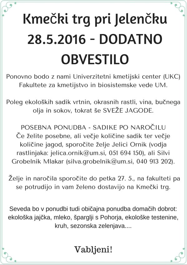 V soboto, 14.5. , boste poleg običajnih dobrot (kruh, testenine, jajčka, mleko...) lahko nabavili ekološke sadike vrtnin, Meranova vina, jabolčni sok, bučno olje in še kaj.