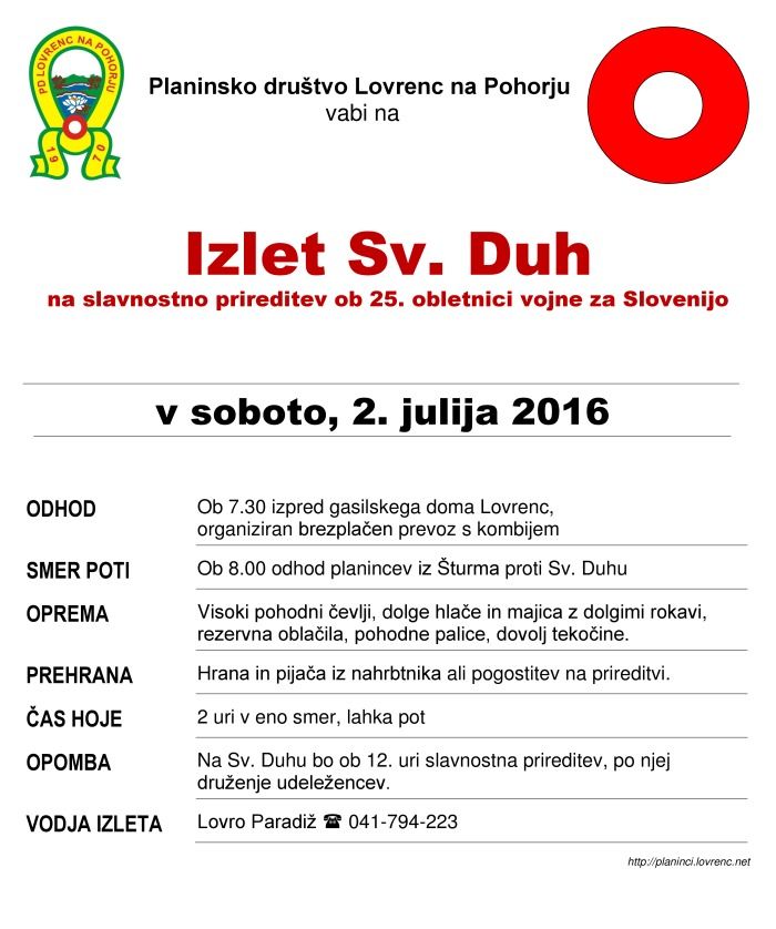 Pohod na Sv. Duh, kjer bo ob 12. uri spominska slovesnost ob 25. obletnici vojne za Slovenijo.