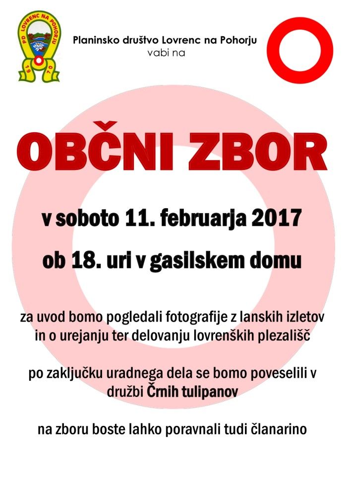 Planinsko društvo Lovrenc na Pohorju vabi na redni letni OBČNI ZBOR, ki bo v soboto 11. februarja 2017 ob 18. uri v gasilskem domu