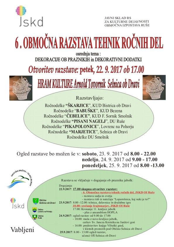 6. območna razstava tehnik ročnih del na kateri sodelujejo ročnodelke iz Lovrenca, Selnice, Ruš, Smolnika, Bezene in Bistrice.