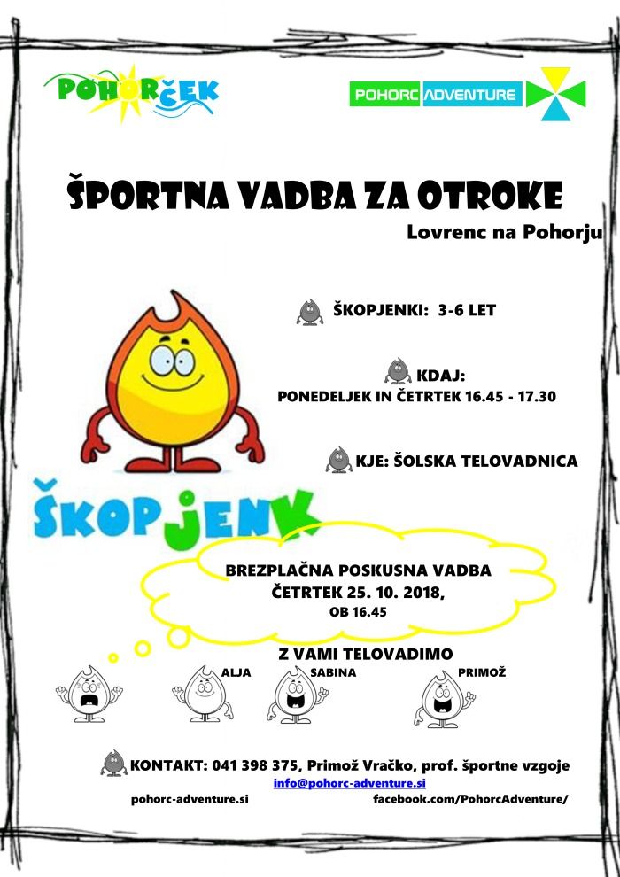 Rekreativno društvo POHORC ADVENTURE vabi najmlajše, da se skupaj razgibamo in igramo na športni vadbi ŠKOPJENK, ki se prične z mesecem novembrom.
