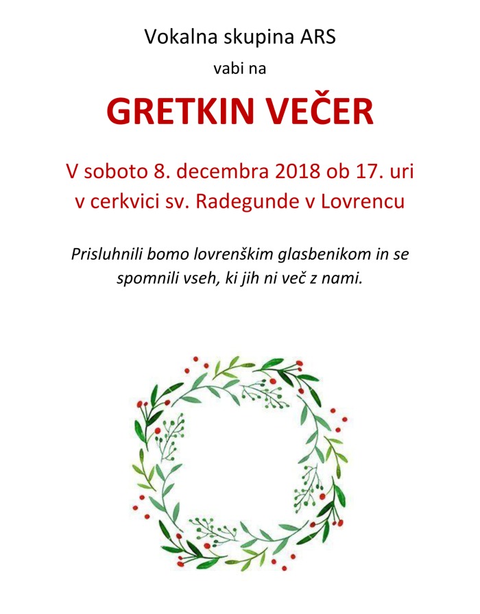 GRETKIN VEČER v soboto, 8. decembra 2018, ob 17. uri v cerkvici sv. Radegunde v Lovrencu.