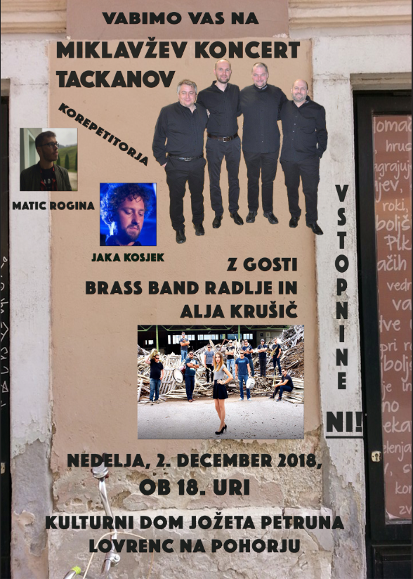 Praznični koncert Tackanov z gosti Brass Band Radlje in Aljo Krušič ter glasbeno spremljavo Matica Rogine in Jake Kosjeka.