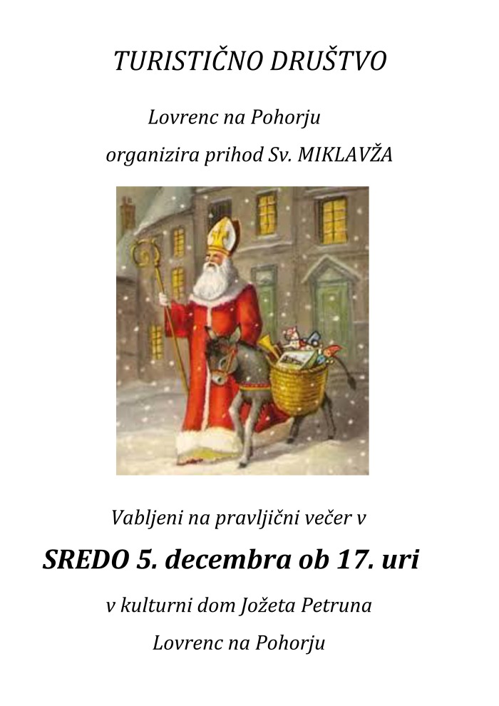 TURISTIČNO DRUŠTVO Lovrenc na Pohorju organizira prihod Sv. MIKLAVŽA