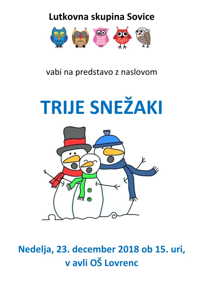 V okviru božičnega sejma bodo Sovice v avli osnovne šole uprizorile predstavo Trije snežaki.