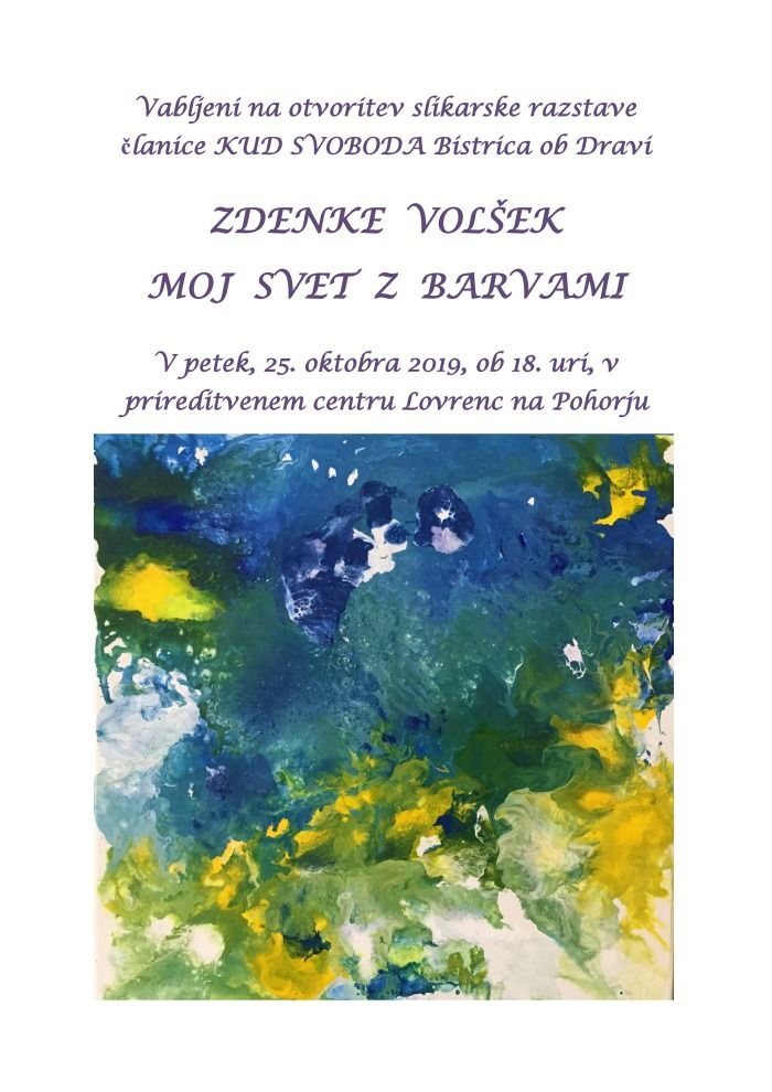 Vabljeni na otvoritev slikarske razstave članice KUD SVOBODA Bistrica ob Dravi ZDENKE VOLŠEK "MOJ SVET Z BARVAMI"