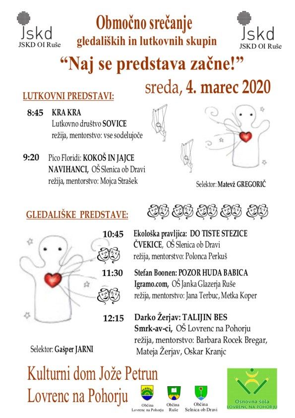 Območno srečanje lutkovnih in gledaliških skupin "Naj se predstava začne", v organizaciji JSKD OI Ruše, bo potekalo v Kulturnem domu Jože Petrun v Lovrencu na Pohorju.
