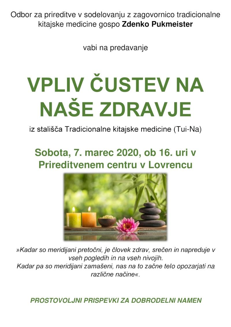 Odbor za prireditve v sodelovanju z zagovornico tradicionalne kitajske medicine gospo Zdenko Pukmeister vabi na predavanje "VPLIV ČUSTEV NA NAŠE ZDRAVJE" iz stališča Tradicionalne kitajske medicine (Tui-Na).