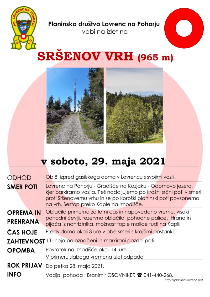 Namesto v Paklenico se bomo to soboto odpravili čez Dravo na Sršenov vrh nad Kaplo. Lažji izlet primeren tudi za družine in starejše.