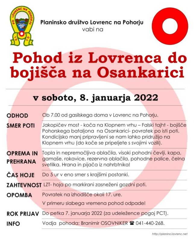 V spomin poslednjega boja Pohorskega bataljona pri Treh žebljih bo v soboto, 8. januarja , ob 11. uri na prizorišču spominska slovesnost. Lovrenški planinci se bomo tja odpravili peš iz Lovrenca. Odhod ob 7. uri izpred gasilskega doma ali dve uri kasneje s Klopnega vrha.