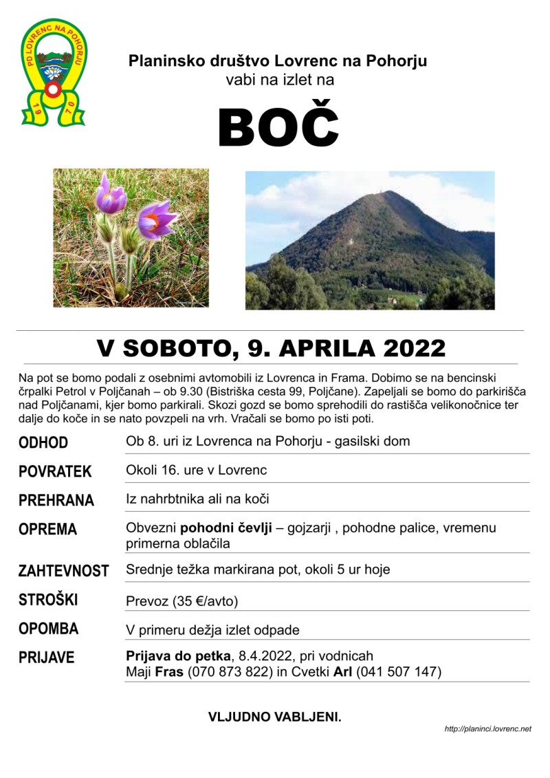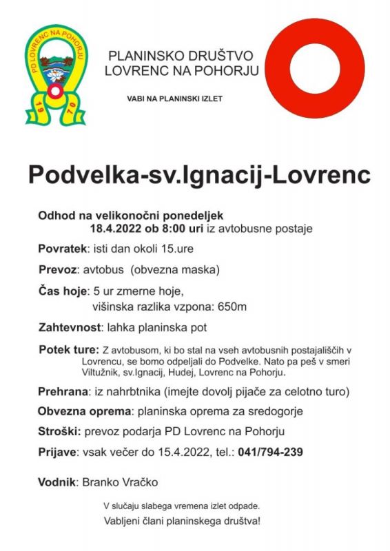 Planinski izlet na velikonočni ponedeljek. Z avtobosum se bomo peljali do Podvelke, nato pa peš na Rdeči breg do sv. Ignacija in nazaj v Lovrenc.