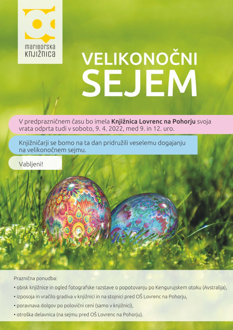 Kot že ustaljen del krajevnih priprav na praznik velike noči bo v soboto, 9. aprila 2022, od 9. ure naprej potekal razstavno-prodajni sejem. Dogajanje bo potekalo na dvorišču/igrišču pred Osnovno šolo Lovrenc. Ponovno se bodo predstavili lokalni ponudniki hrane in drugih butičnih izdelkov. Sočasno s sejemsko dejavnostjo bo v avli šole ob 10. uri lutkovna predstava Bravo, putka, v izvedbi Lutkovnega društva Sovice, predstavili se bodo tudi mladi pevci, najmlajše pa čaka presenečenje. Med 9. in 12. uro bo odprla vrata tudi Knjižnica Lovrenc z razstavo fotografij, polovično poravnavo dolgov, izposojo njig in delavnico.