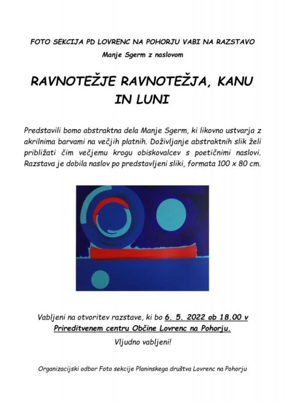Fotosekcija Planinskega društva Lovrenc na Pohorju vabi na otvoritev druge letošnje razstave. Predstavili bodo abstraktna dela Manje Sgerm, ki likovno ustvarja z akrilnimi barvami na večjih platnih in želi doživljanje abstraktnih motivov približati širšemu krogu... več