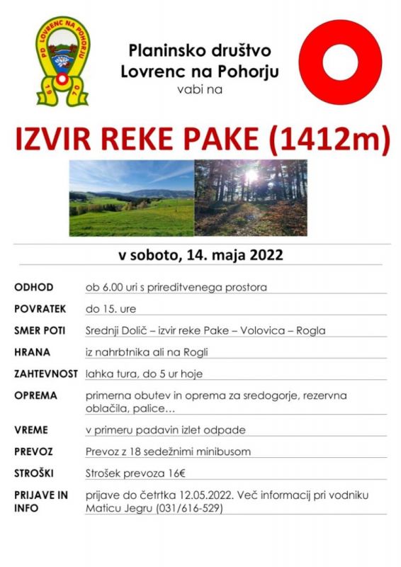 Planinsko društvo vabi v soboto, 14. maja 2022 na planinski izlet iz Doliča pri Mislinji do izvira reke Pake na Volovici in naprej na Roglo. Prevoz z mini-busom.