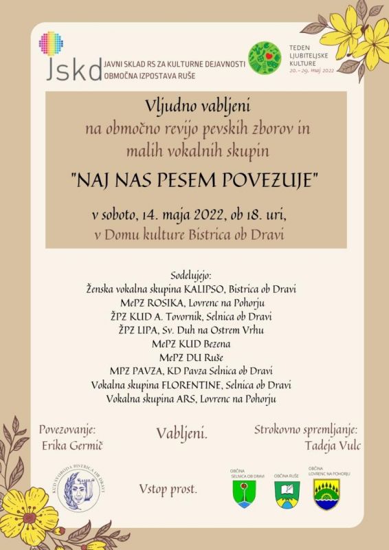 Po treh letih se bodo ponovno zbrali in zapeli pevski zbori in male vokalne skupine iz izpostave JSKD OI Ruše. S tremi pesmimi se bo predstavilo šest pevskih zborov in tri male vokalne skupine. Na odru bo zapelo skupaj 125 pevcev in pevk. Prihajajo iz Občine Lovrenc na Pohorju, Občine... več