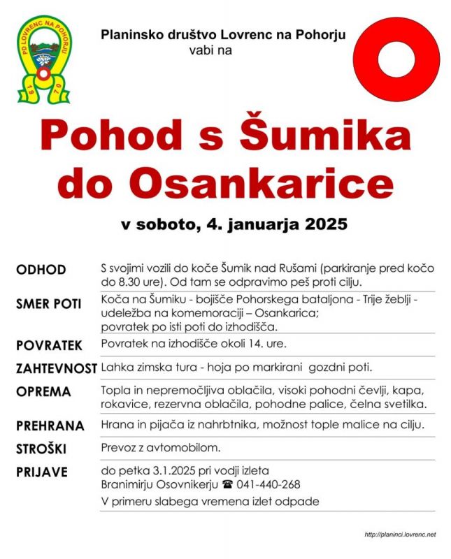 Planinsko drutvo Lovrenc vabi v soboto, 4. januarja 2025, na zimski pohod s Šumika do Treh žebljev, kjer bo spominska slovesnost ob 80. obletnici poslednjega boja Pohorskega bataljona. Podrobnosti v priloženem razpisu.