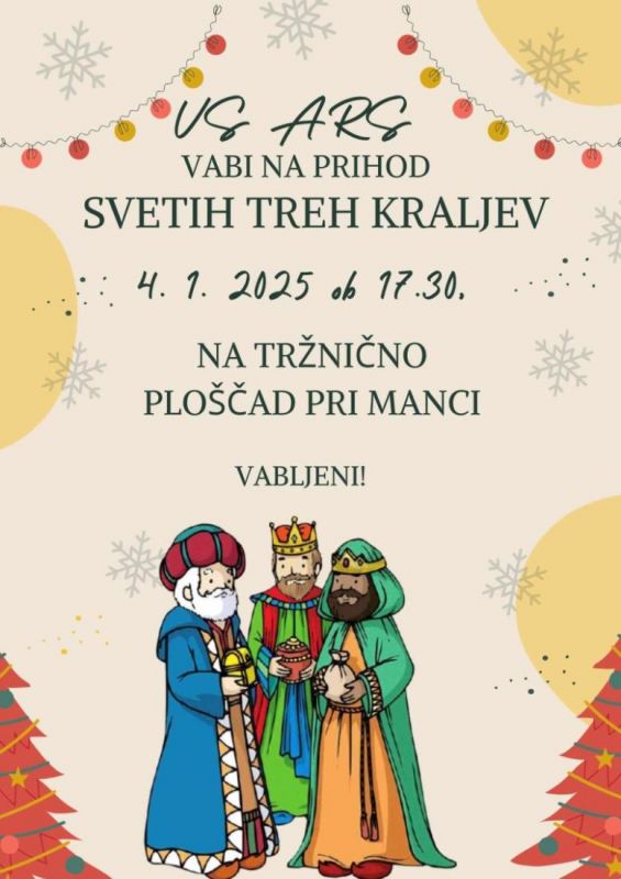 Vokalna skupina ARS vabi v soboto, 4. januarja, na ploščad pred turistično pisarno na prihod Svetih treh kraljev. S koledniškimi pesmimi se bomo poslovili od božičnega obdobja.
