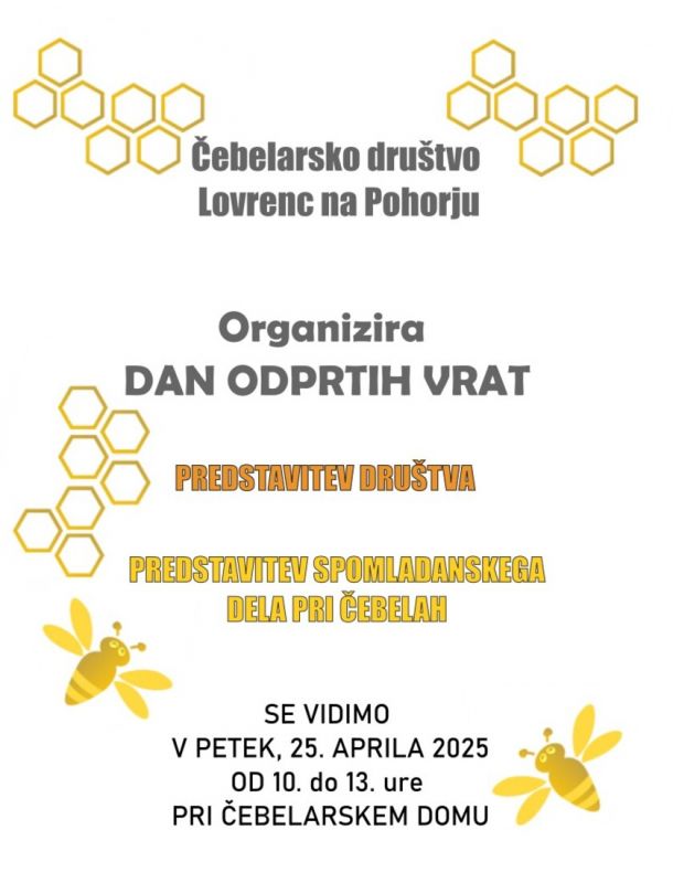 Čebelarsko društvo Lovrenc vabi v petek, 25. aprila 2025, med 10. in 13. uro na dan odprtih vrat. Predstavili bodo spomladansko delo pri čebelah.