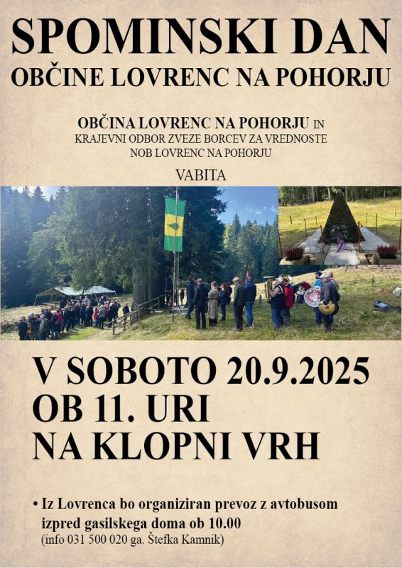 Občina Lovrenc na Pohorju in Krajevni odbor Zveze borcev za vrednote NOB Lovrenc na Pohorju v soboto, 20. septembra 2025 ob 11. uri, vabita na spominsko slovesnost ob spomeniku padlim borcem na Klopnem vrhu. Odhod avtobusa ob 10:00 izpred Gasilskega doma.