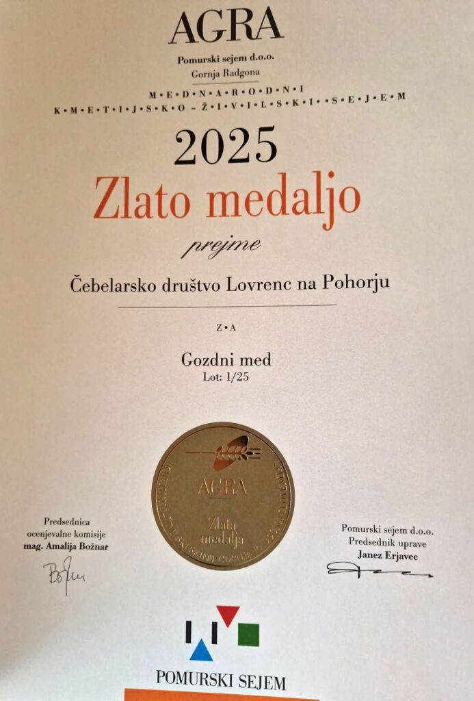 Čebelarsko društvo Lovrenc na Pohorju je na ocenjevanu medu z mednarodno udeležbo na MEDNARODNO KMETIJSKO-ŽIVILSKEM SEJMU AGRA, za naš Gozdni med že drugič zapored pridobilo zlato medaljo.