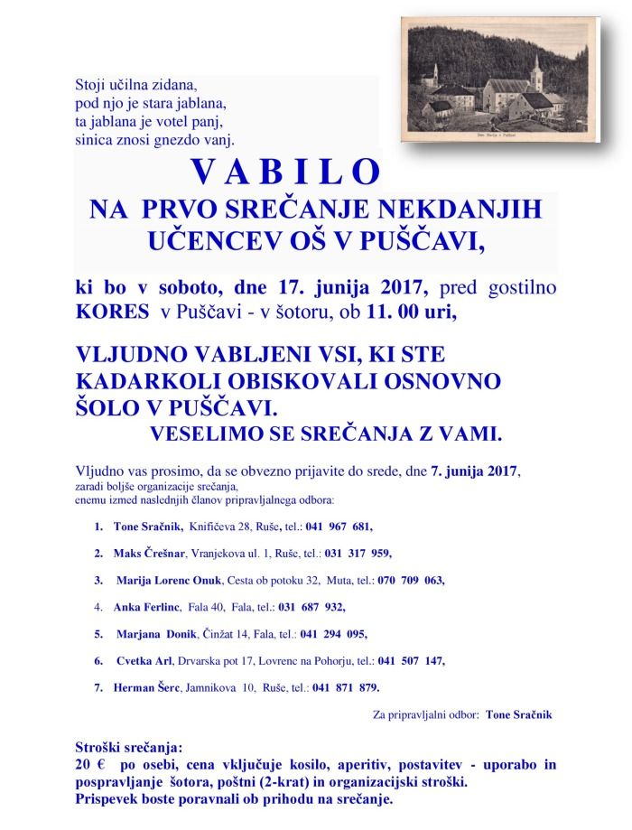 Pripravljalni odbor vabi nekdanje učence osnovne šole v Puščavi na srečanje v soboto 17. junija.