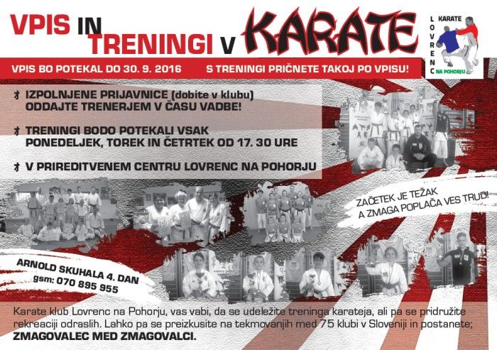 Trening karateja objava 20. 09. - 30. 09. 2016, avtor KK Lovrenc, Arnold Skuhala Vpis in treningi karateja za začetnike.