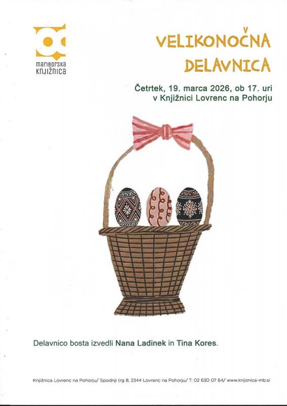 Velikonočna delavnica Kdaj: 19. 3., ob 17.00 Kje: Občina Lovrenc na Pohorju Kdo: Pridružite se nam na veseli velikonočni delavnici za otroke, kjer bomo ustvarjali velikonočne venčke in girlande.